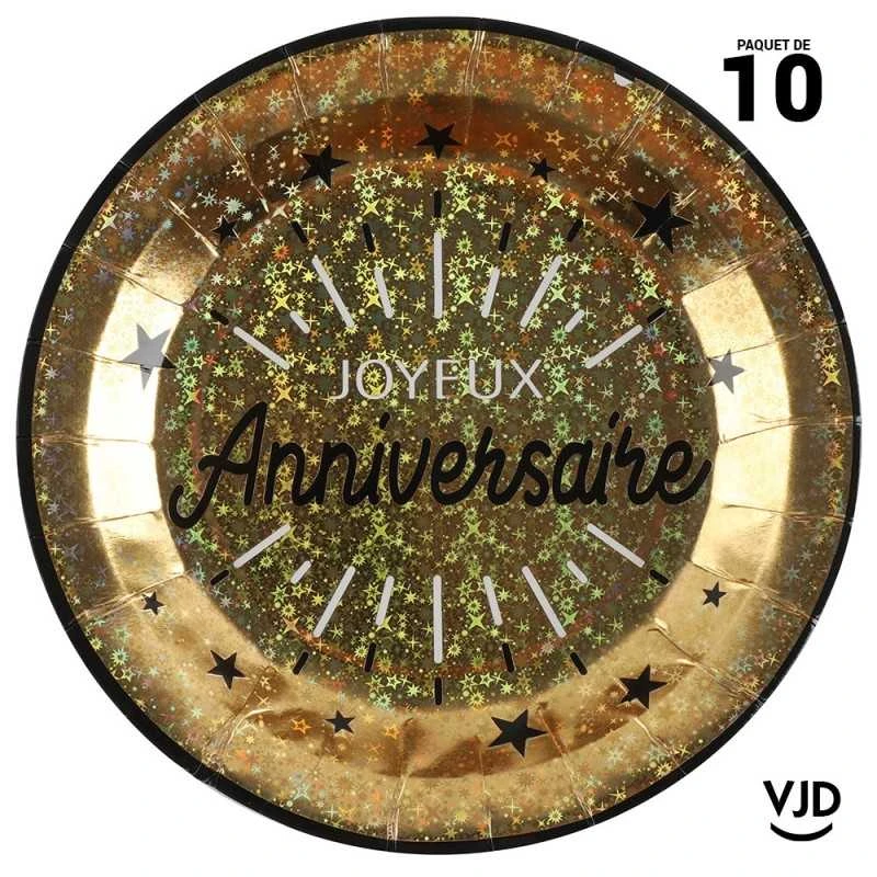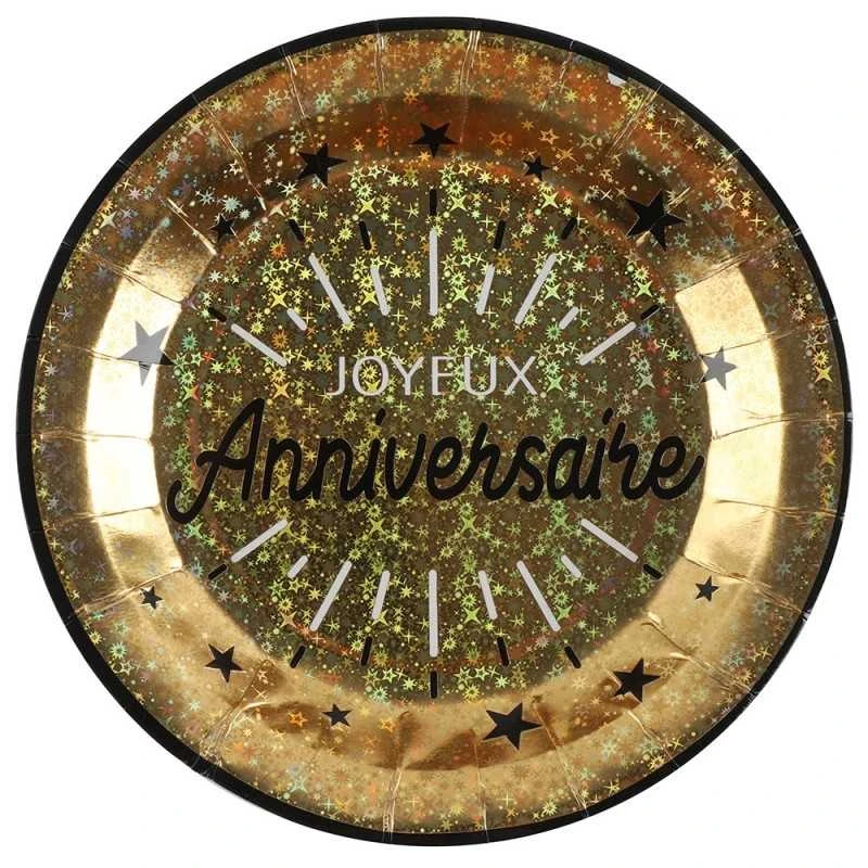 Ces assiettes de fêtes rondes possèdent un fond or à l’effet irisé sur lequel l’inscription anniversaire apparaîtra de façon graphique et très élégante en lettres noires.