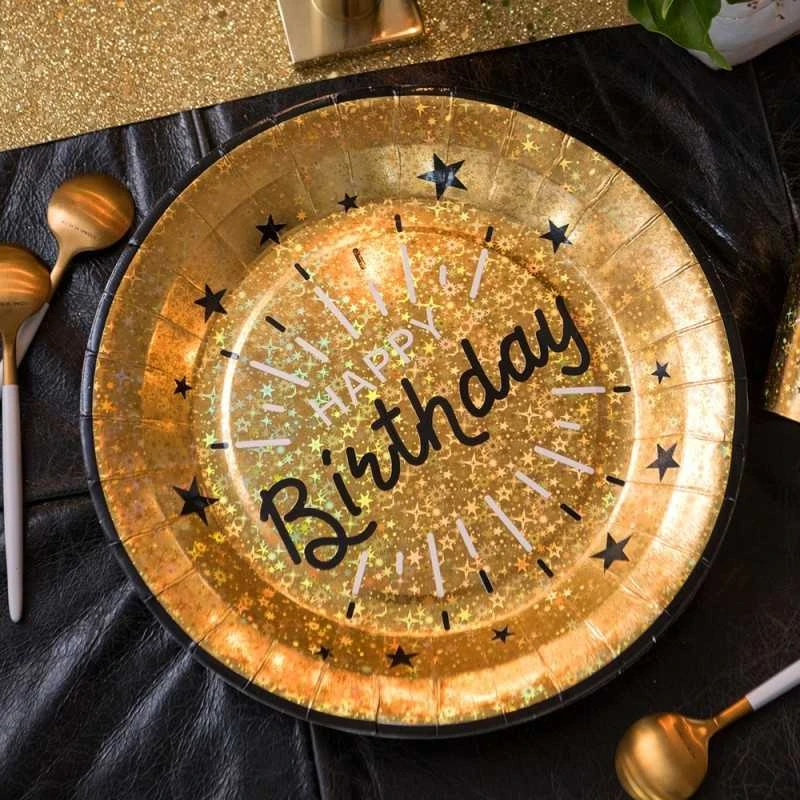 Ces assiettes de fêtes rondes possèdent un fond or à l’effet irisé sur lequel l’inscription birthday apparaîtra de façon graphique et très élégante en lettres noires.