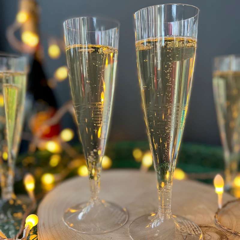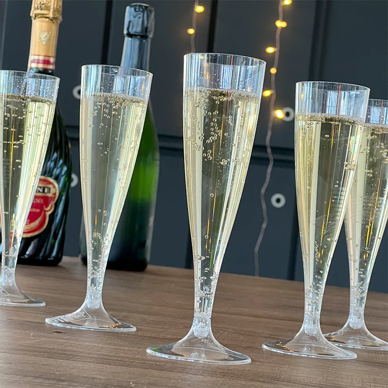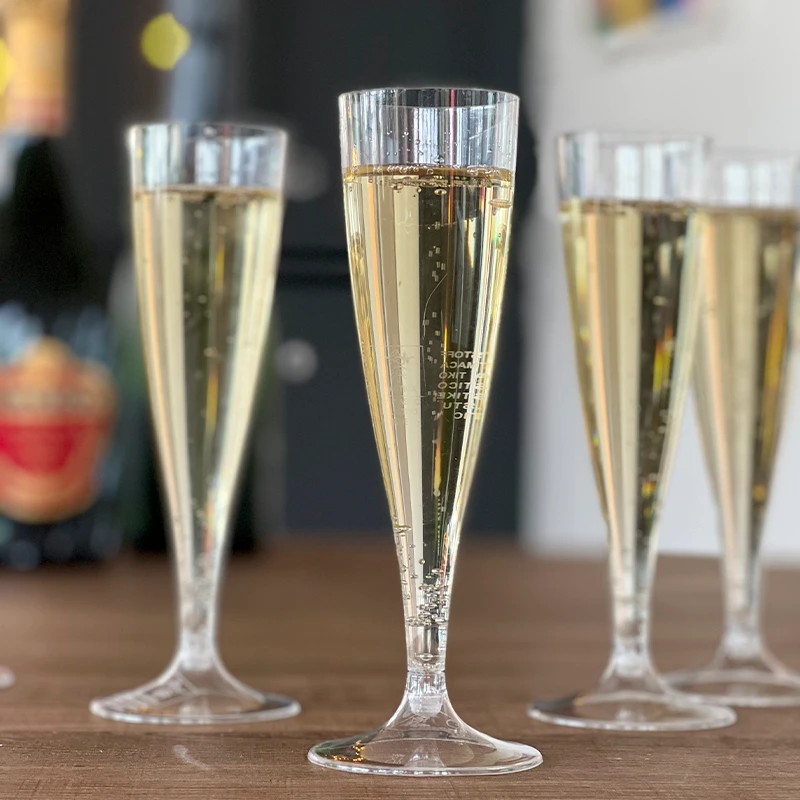 100 flûtes champagne 14 cl réutilisables transparentes sur pied.