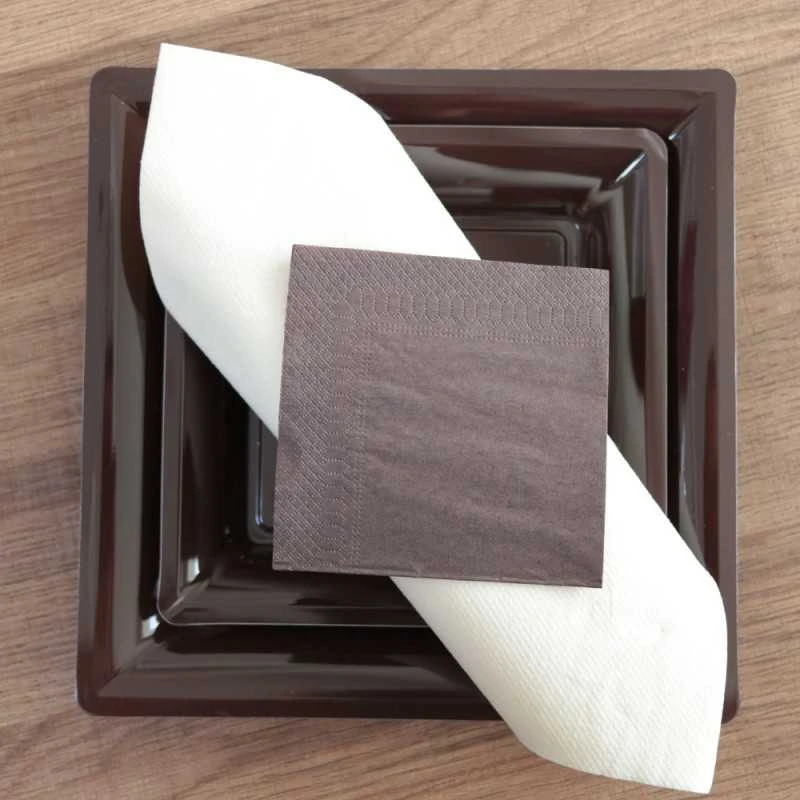 Chez Vaisselle Jetable Discount, une assiette carrée chocolat va effectivement donner un style particulier à votre table. La couleur et la forme y sont pour quelque chose !