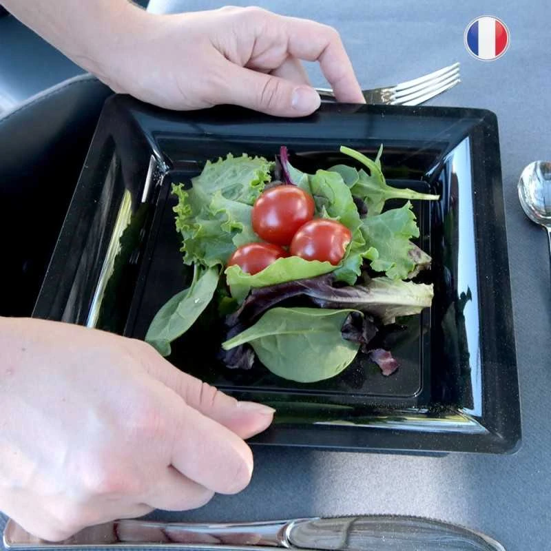 Nos assiettes en plastique carrées noires sont fabriquées en France.