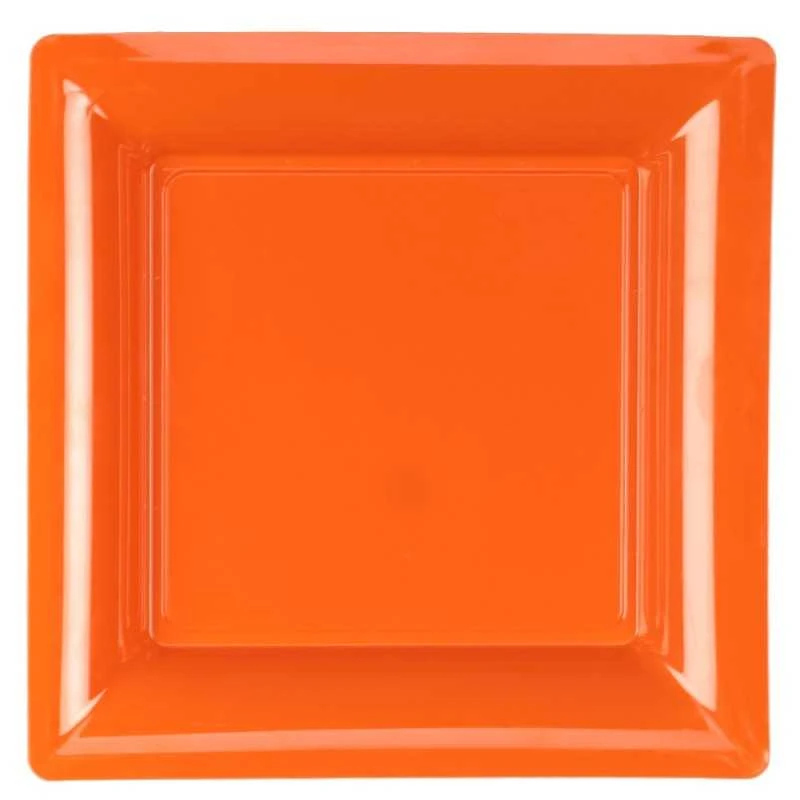 Nos assiettes en plastique carrées orange fabriquées en France.
