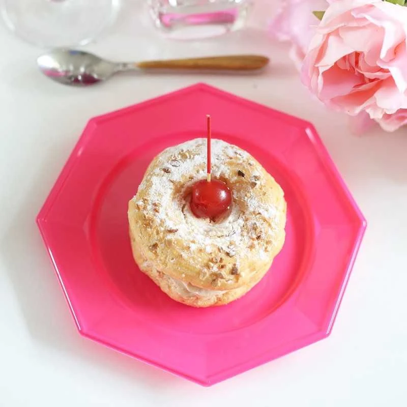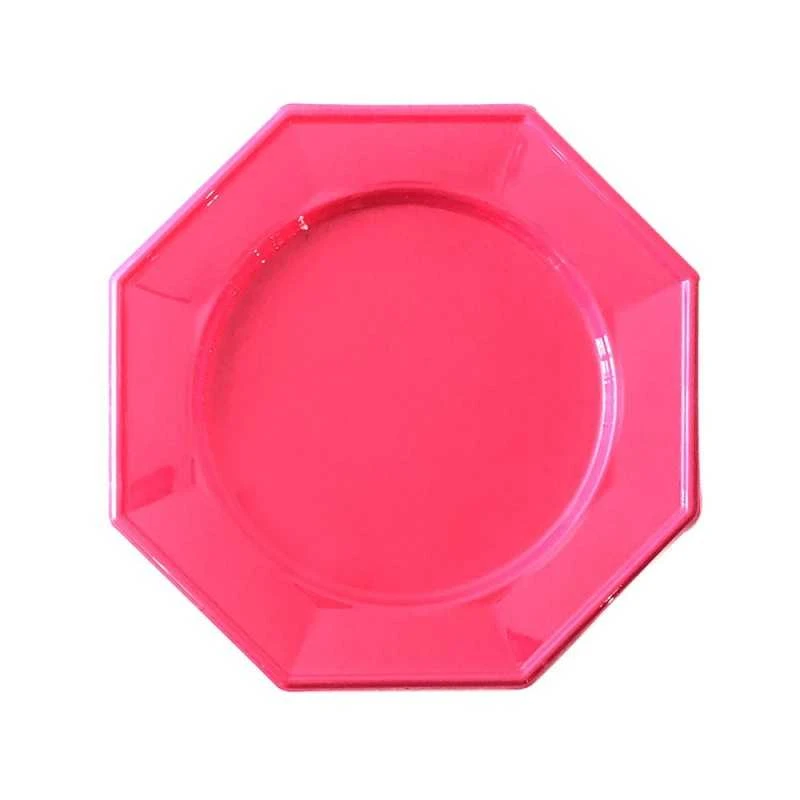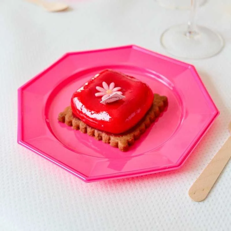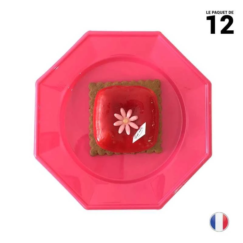 Cette assiette octogonale fuchsia est proposée en deux dimensions selon que vous servirez un plat principal, un fromage ou un dessert.