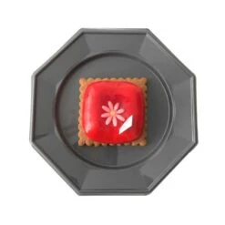 Commençons par sa forme, octogonale. C’est une forme intéressante pour son esthétique complexe à huit côtés. C’est pour cela qu’elle ne laisse pas indifférent et que nous l’avons retenue. Elle est à mi-chemin entre un carré et un cercle. Dans la symbolique, on dit que c’est la forme de la transition d’un monde à l’autre. D’ailleurs les fonts baptismaux étaient souvent de forme octogonale. Du coup ces assiettes grises et octogonales vous ne les regarderez plus de la même manière !