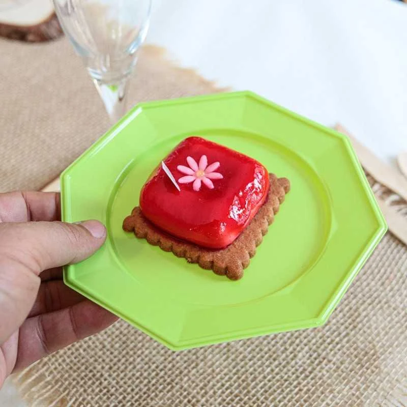 L’assiette octogonale que nous vous présentons est proposée en deux dimensions selon que vous servirez un plat principal, un fromage ou un dessert. Et comme elle est belle et correspond tellement à ce que vous aimez, vous aurez du mal à vous en séparer. Bonne nouvelle, comme elle est fabriquée dans une belle matière, elle est réutilisable pour un autre repas, d’autres bons moments.