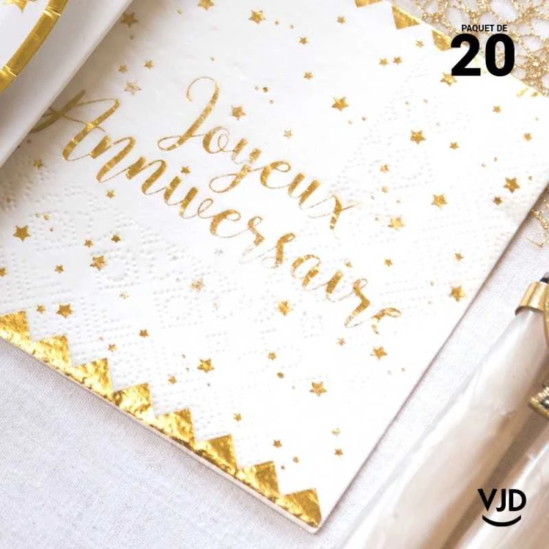 Un décor blanc et or pour fêter un anniversaire s’avèrera tendance et sera apprécié de tous vos invités. Ces serviettes seront donc de la fête et se montreront très utiles.