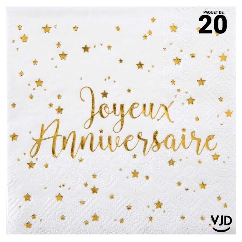 Grâce à leur décor soigné sur fond blanc, ces serviettes de fêtes mettront en illustration des étoiles dorées ainsi que l’inscription Joyeux anniversaire ! Un rendu d’ensemble particulièrement chic et élégant.