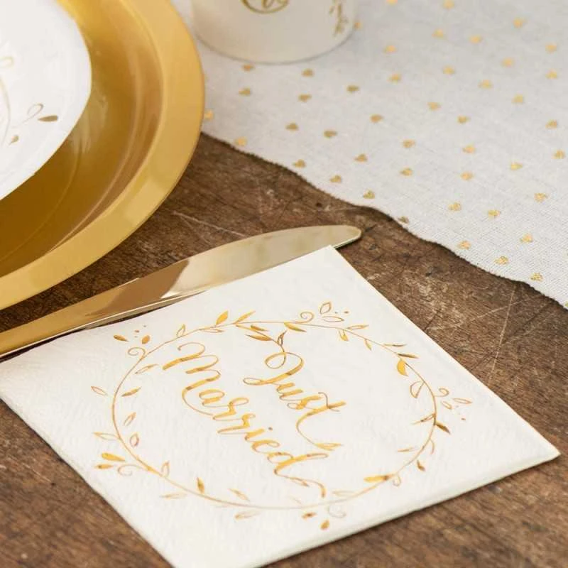 Voici de magnifiques serviettes avec les caractères « Just Married » de couleur dorée pour embellir votre table lors d’un vin d’honneur, buffet, repas ou dessert de mariage.