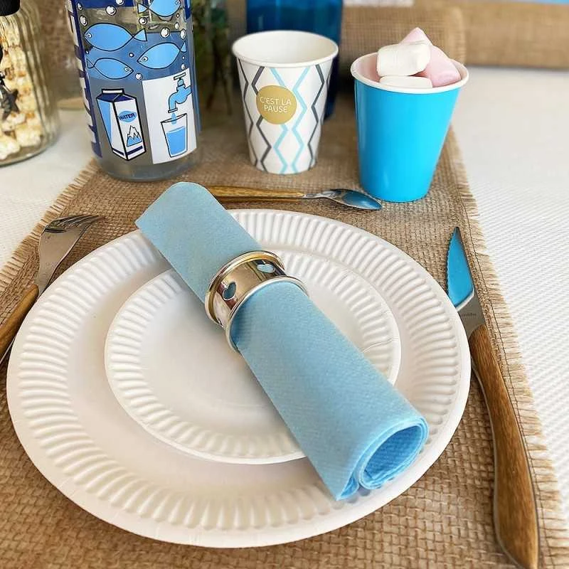 Avec une serviette bleu clair en non-tissé qui absorbe 6 fois son poids, vous êtes à l’abri de ne pas pouvoir éponger tous les petits accidents de table… Epaisseur et résistance, un autre joli duo !