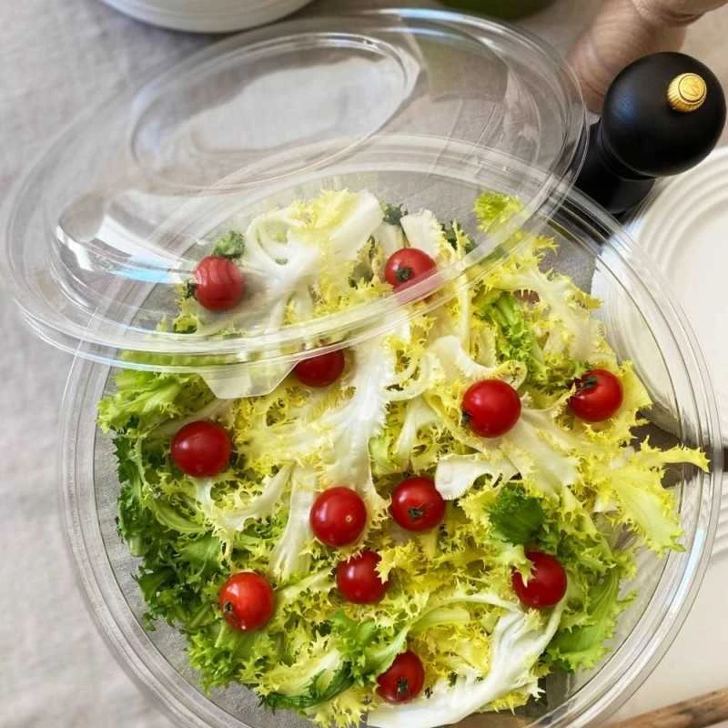 Le saladier et le couvercle sont fabriqués en PET, une matière recyclable de très grande qualité et à la belle transparence. Bien que très légèrement souple au toucher, ce saladier et ce couvercle sont rigides et épais.