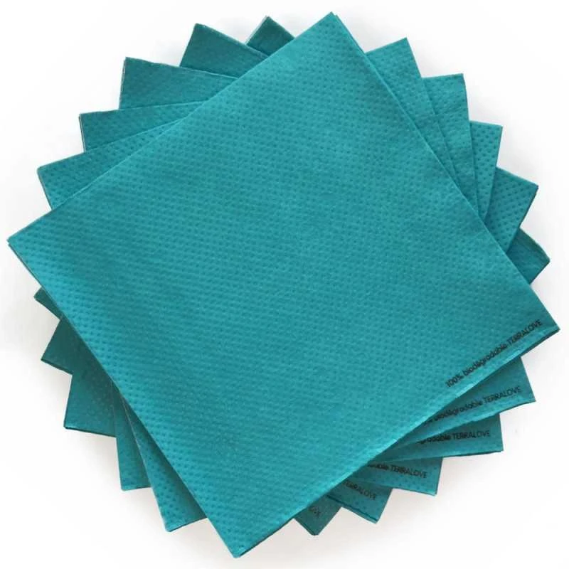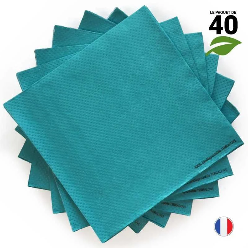 Cette serviette bleue est en TerraloveÒ. Une matière révolutionnaire qui permet à ces serviettes fabriquées en France, d’être sans liant chimique, sans substance allergogène et avec des encres natures ! Le Terralove est une matière résistante, douce et très absorbante avec un rendu aussi qualitatif et efficace qu’une serviette en non-tissé.