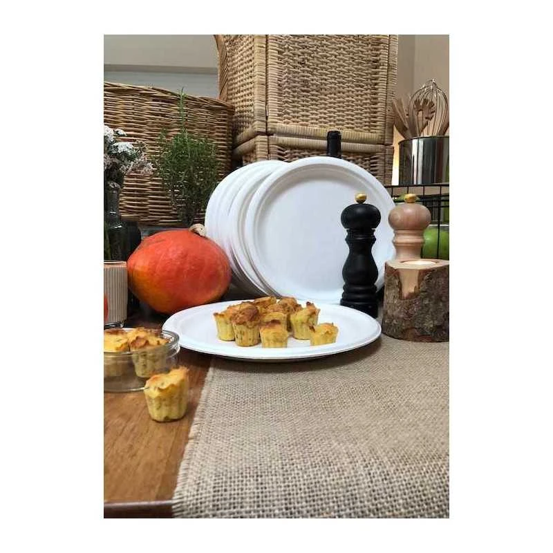Écologique et durable : Fabriquées à partir de fibre de canne à sucre, ces assiettes sont donc naturelles, offrant une alternative respectueuse de l’environnement aux assiettes en plastique jetables.