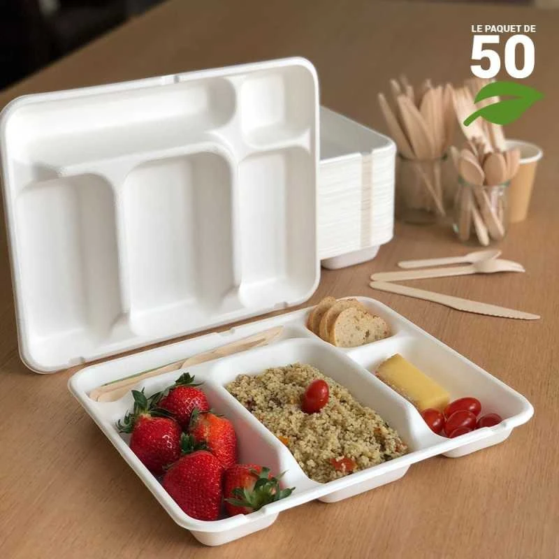 En plus ce plateau est agréablement dessiné ce qui n’est pas courant et qui le différencie des « boites à cases » que l’on voit trop souvent. Les 5 compartiments de tailles différentes, offriront la place et le volume à ce qui constitue un repas classique, fromage et dessert si on veut.