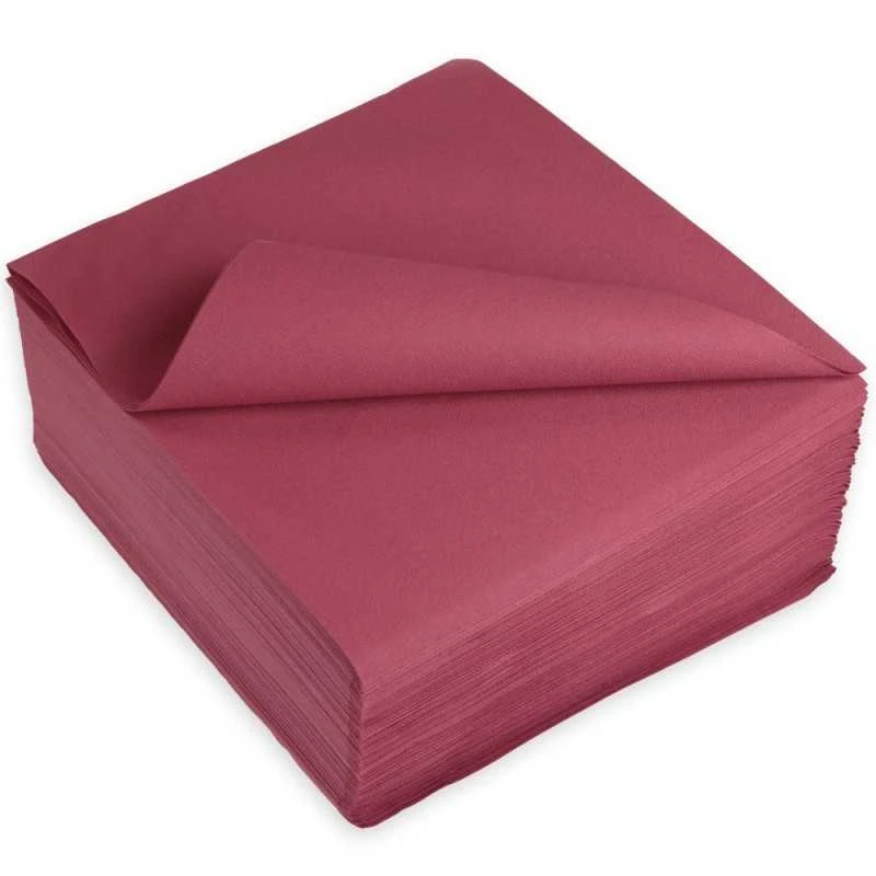 Ici ce sont des serviettes de couleur Bordeaux proposées avec un effet lin dont le subtil gaufrage en croisillons donnera un grain qui s’apparente à celui des belles serviettes en tissus.
