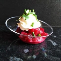 Chez Vaisselle Jetable Discount nous sommes très fiers de cette verrine « cup » car, pour nous, elle traduit de belle manière la combinaison entre un design rĂ©ussi et les effets parfois spectaculaires des recettes de verrines lorsqu’il s’agit de superposer les ingrĂ©dients en couches de couleurs, de textures et de saveurs.