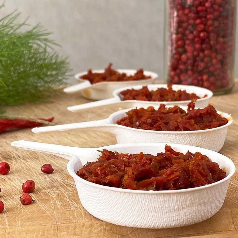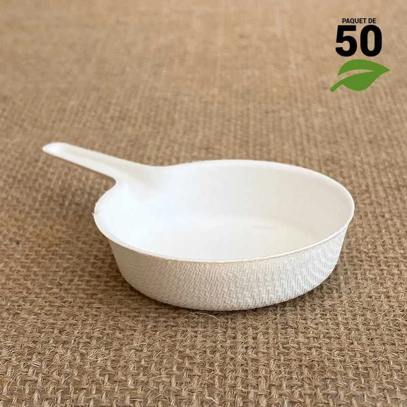 Cette verrine fabriquée en pulpe végétale (fibre de canne à sucre) est naturelle, résiste à l’eau, à la graisse et passe au micro-ondes, voilà de bons débuts !