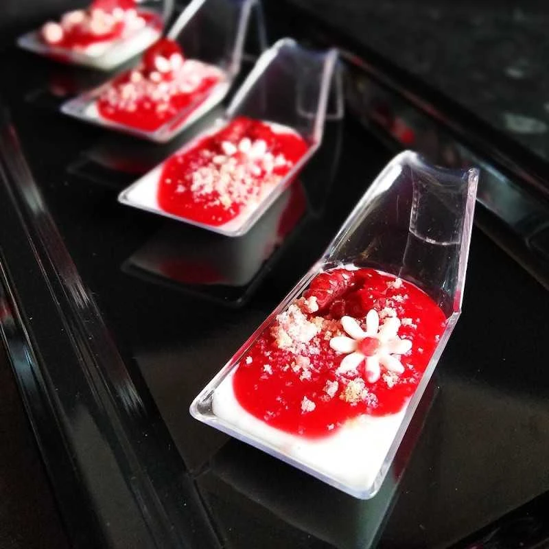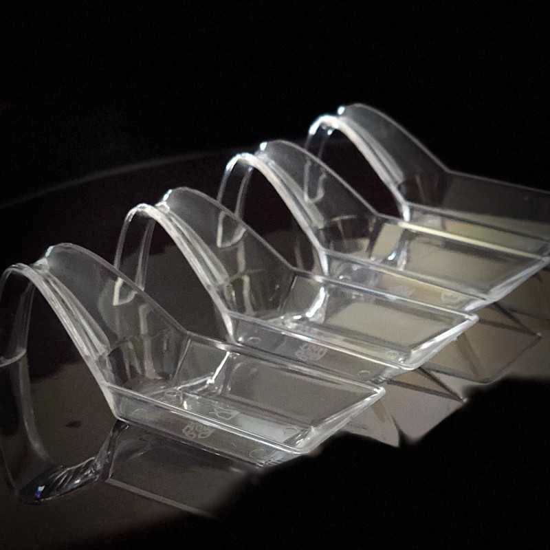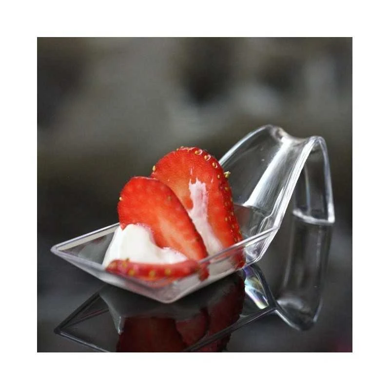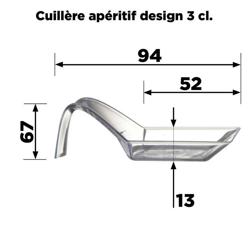 Cette verrine apéritive présente une forme en cuillère qui rend sa présentation des plus pratiques, là où beaucoup de verrines sont délicates à remplir. En plus la forme a un effet direct sur la stabilité sur une table ou un plateau au milieu de vos nombreux convives même les plus remuants. Sa contenance ? 3 cl ce qui représente à peu près une bouchée.