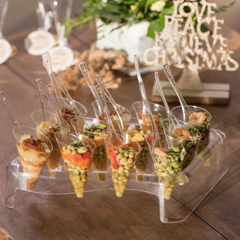 - 60 verrines transparentes coniques. Bien pointues et bien évasées, côté design, vous et vos invités craquerez au premier coup d’œil !