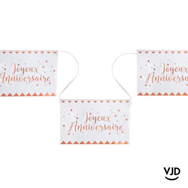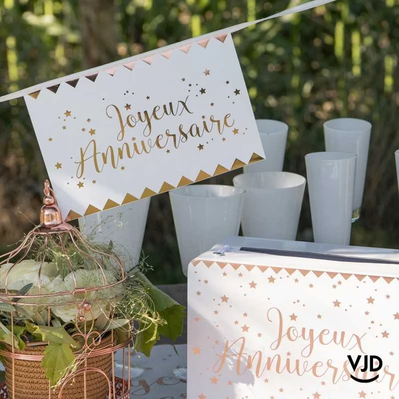 - Cette banderole joyeux anniversaire blanche et or est composée de 12 fanions rectangulaires à effet métal sur lesquels l’inscription Joyeux anniversaire est réalisée en lettres dorées dans un graphisme moderne et sur un fond blanc étoilé ! La dimension de ces fanions est de 20 cm par 13 cm. Soyez sûrs qu’ils seront bien vus de tous !