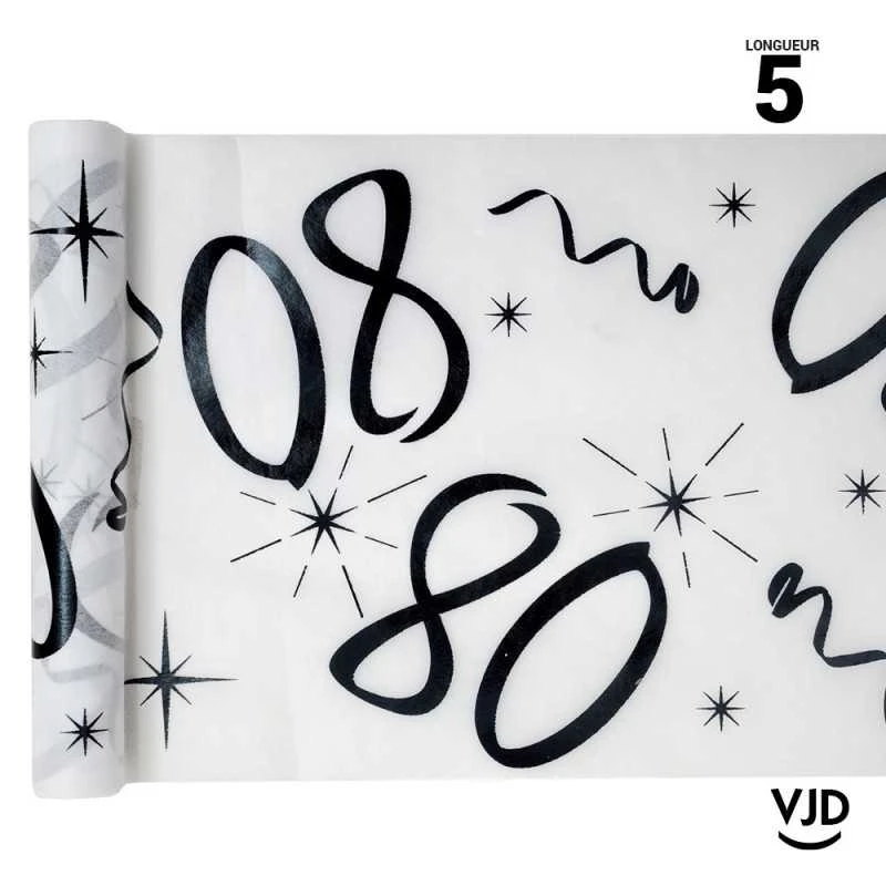 Quelle joie que celle de fêter des 80 ans ! Avec ce chemin de table blanc et noir 80 ans, vous créerez sur votre table d’anniversaire une décoration festive et épurée !