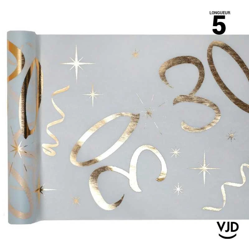 Pour fêter des 30 ans, ce chemin de table blanc et or à effet métallisé sera à la hauteur de l’évènement ! Festif et élégant, il fera un rappel au bel anniversaire que vous fêtez !