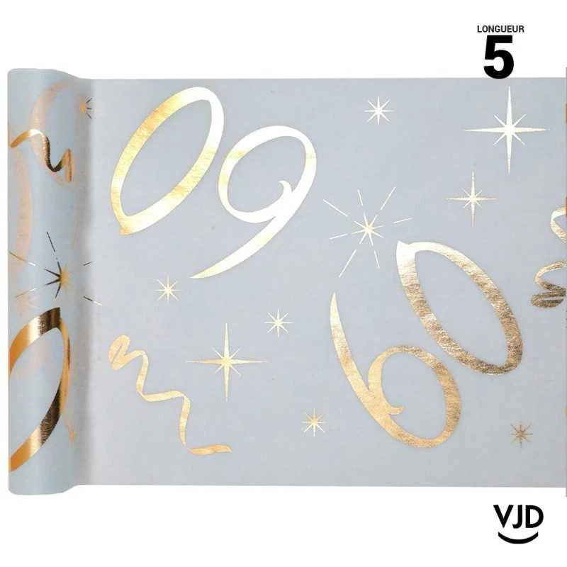 Ce chemin de table blanc et or à effet métallisé possède une grande qualité : Celle d’être à la fois festif et élégant. Il rappelle brillamment le bel anniversaire et l’âge de 60 ans que vous célébrez.