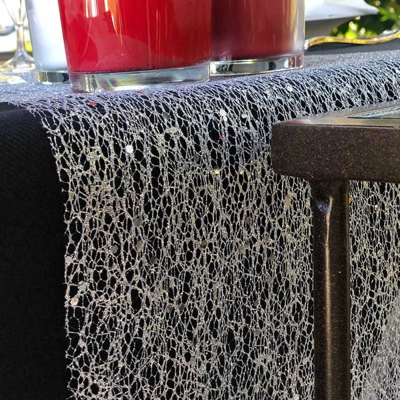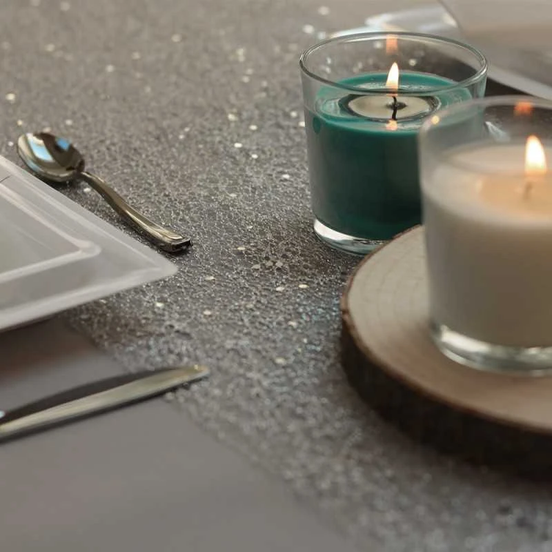 Et là, arrive l’heure de la grande question : Quelle nappe va-t-on dérouler pour accueillir comme il se doit ce magnifique et brillant chemin de table ? Partons-nous sur du noir, du gris béton ou gris titane ? Ne réfléchissez plus et laissez votre coeur parler car avec un tel chemin de table, croyez en notre expérience, tous les choix sont… »brillants »…