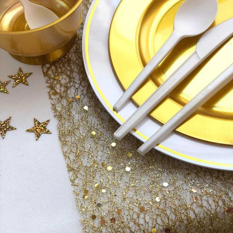 Bon, c’est bien joli tout ça, mais il faut se poser la question du choix de la nappe sur laquelle va être disposé ce chemin de table glitter or. Pour vous aider, sachez que ce chemin de table est réalisé dans une texture légère et transparente qui laissera un peu passer la couleur de la nappe qui est en dessous. C’est bien pourquoi le choix des couleurs d’association est important. Avec la couleur or, couleur du faste, du luxe et dont on dit qu’il réchauffe le cœur et l’esprit, vous ne pouvez pas vous tromper en choisissant du noir, du marron ou du rouge. D’autres associations sont possibles et en grand nombre car la couleur or se marie bien avec la plupart des couleurs. Pensez au violet ou au blanc, à l’ivoire aussi. Donc le choix est large pour des ambiances variées et nuancées. Mais la couleur de la nappe n’est pas le seul enjeu. Pensez aussi aux couleurs des serviettes, des assiettes, des verres. Chez Vaisselle Jetable Discount, vous devriez trouver toutes ces couleurs dans nos gammes pour installer un style … brillant !