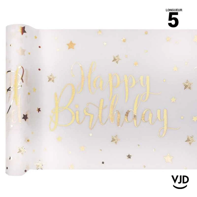 C’est sur un fond blanc que ce chemin de table de fêtes met en scène un décor festif. L’inscription Happy Birthday dorée sera facile à associer avec les autres coloris de votre décoration.