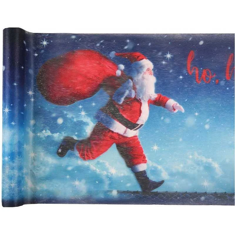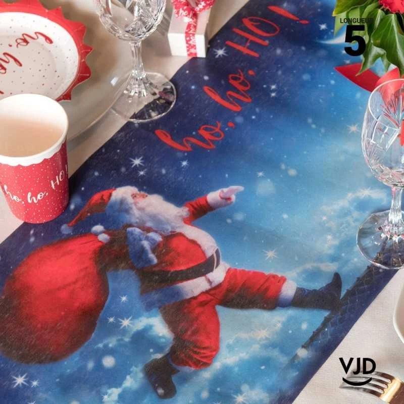 Si vous ne l’avez pas vu passer par la cheminée, peut-être aimerez-vous le voir défiler le père Noël lançant des « ho ho Ho » avec son sac rempli de cadeaux sur ce chemin de table à l’esprit magique !