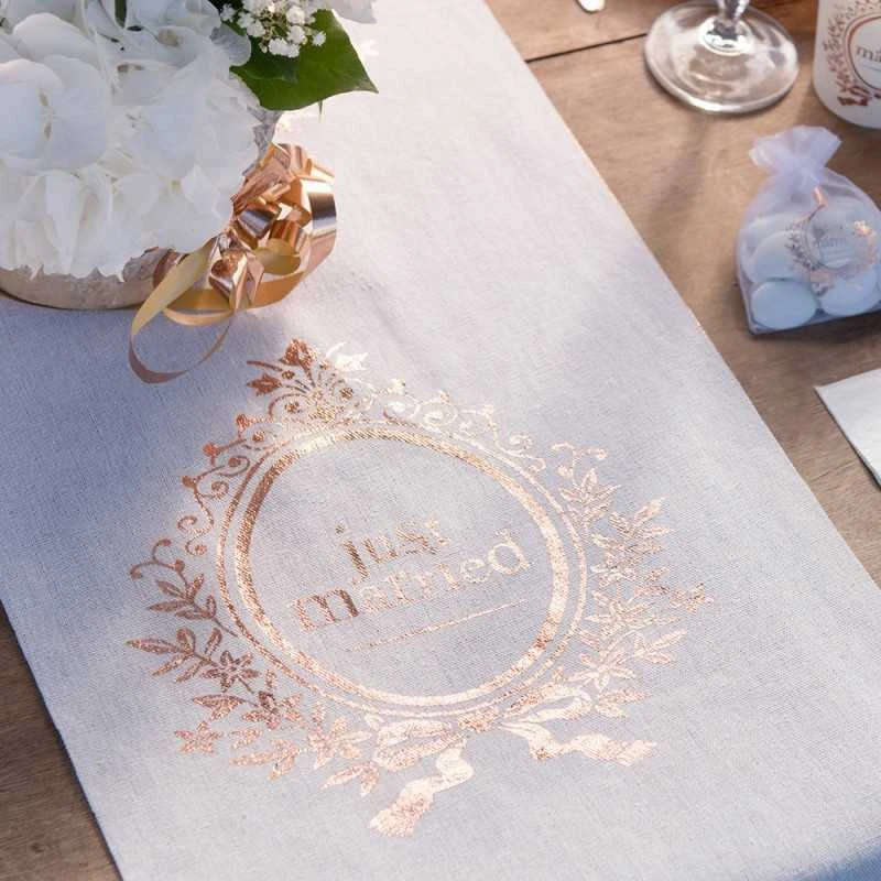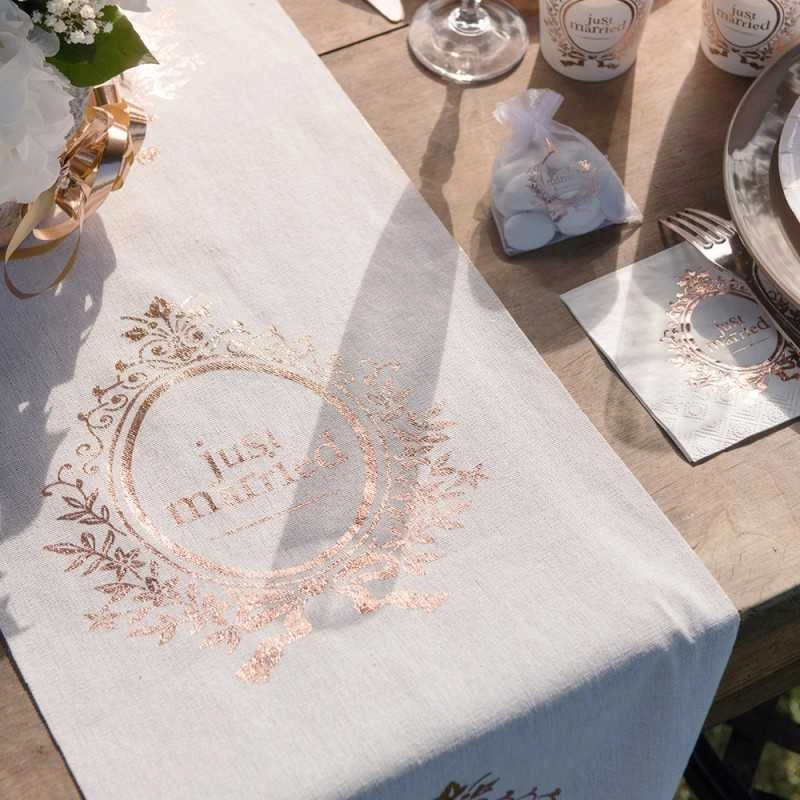 Apportez une touche glamour et chic Ă votre dĂ©co tout en cĂ©lĂ©brant l’amour avec ce chemin de table just married rose gold !