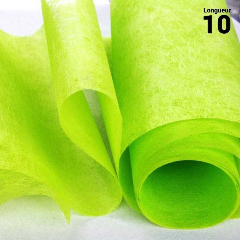 Le non-tissé : c’est un textile dont les fibres sont maintenues de façon aléatoire. Il s’agit d’une feuille manufacturée, constituée de voile ou de nappe de fibres orientées dans une direction particulière ou au hasard, liées par friction, cohésion ou adhésion. C’est cette technique de fabrication qui apporte au chemin de table son confort d’utilisation et sa douceur au toucher lorsqu’il est réalisé dans de bonnes conditions avec de bons matériaux, et c’est le cas içi !
