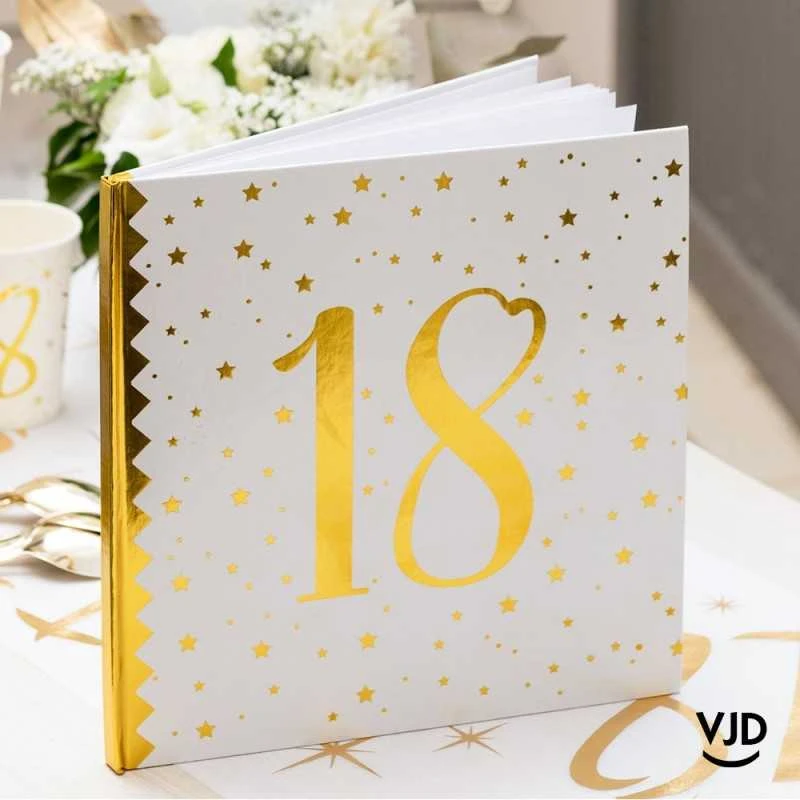 Voilà un livre d’or blanc et or métallisé 18 ans qui pourrait bien être le plus bel invité de votre cérémonie d’anniversaire !