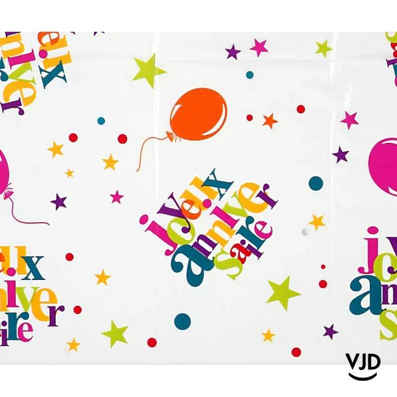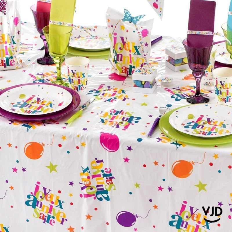 - C’est sur un fond blanc que le décor multicolore de cette nappe anniversaire s’affichera. En plus de jolis ballons, étoiles de différentes tailles et couleurs, l’inscription Joyeux anniversaire écrite dans un graphisme moderne et coloré se répètera tout au long de la nappe.
