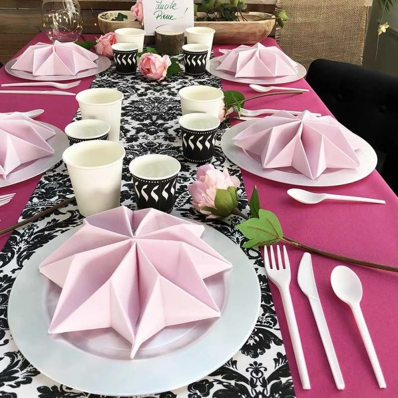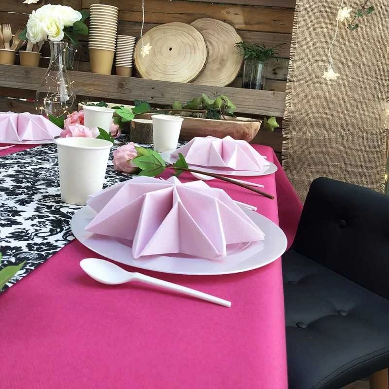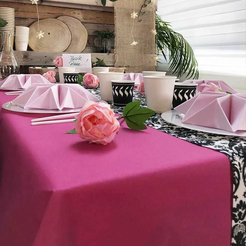Et pour ce qui est de son utilisation, quel confort et quelle allure une fois déployée sur la table ! Elle « tombe » parfaitement comme une nappe en tissu. En plus cette nappe couleur framboise est absorbante et agréable au toucher. Cela est dû essentiellement au fait qu’elle est fabriquée en non-tissé.