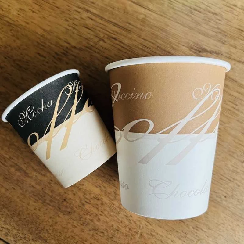100 gobelets en carton de 24 cl. Sur fond blanc, plusieurs inscriptions avec des lettrages différents agrémentent l’ensemble dans des tons marrons clairs.