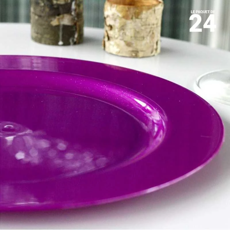 L’assiette ronde que nous vous présentons ici est fabriquée en France, dans une matière plastique de grande qualité qui la rend lavable au lave-vaisselle ou manuellement. Ses reflets pailletés associés à la couleur prune surprendront vos invités les plus blasés ! Vous l’utiliserez pour servir des plats principaux avec son format de 24 cm et des entrées ou des desserts avec sa taille de 19 cm. Vos invités apprécieront son équilibre et son confort d’utilisation lorsqu’ils seront debout durant un apéritif, un lunch ou assis à une table.