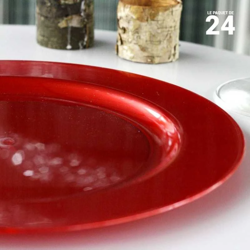 Cette assiette rouge carmin n’a aucune dĂ©coration autre que cette couleur. Cela serait superflu et alourdirait inutilement cette belle assiette ronde et plate. Et cerise â rouge â sur l’assiette cette couleur est intimement associĂ©e Ă des ambiances et des styles bien particuliers