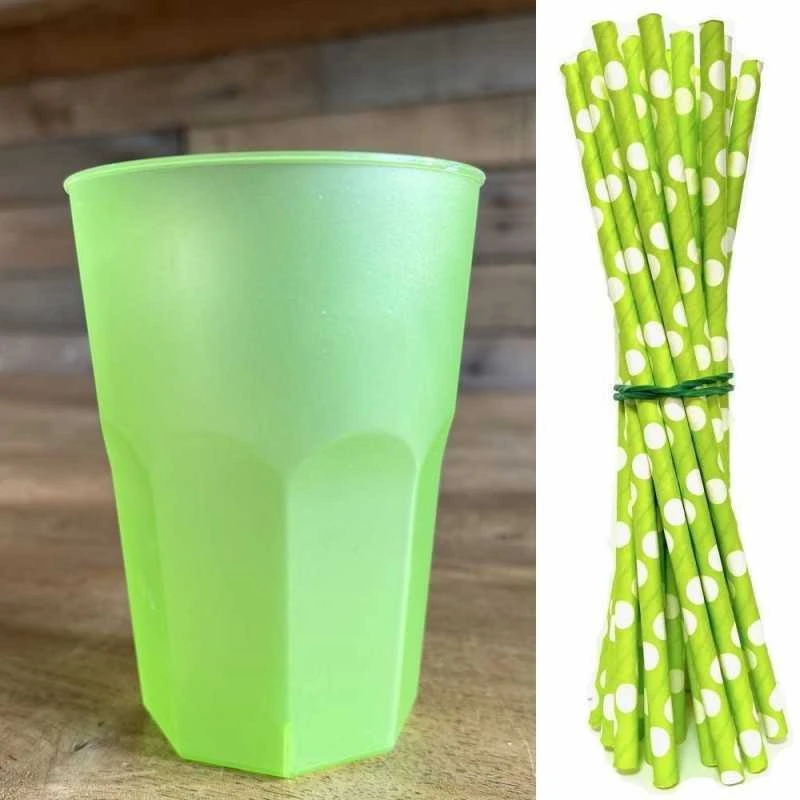 Pack 54 verres cocktail vert + 60 pailles vertes Ă pois blancs.