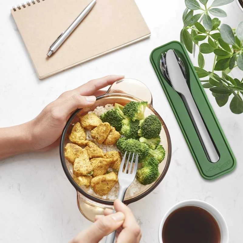 Nous vous proposons le set couverts 4 pièces et son étui de rangement pour vos repas à emporter. Ne vous embarrassez plus des couverts jetables en bois dont la texture est si peu agréable en bouche et choisissez le confort de l’acier inoxydable qui n’altèrera pas le goût de vos aliments et que vous pourrez réutiliser encore longtemps. Pratique avec son étui, le set de couverts inox 4 pièces vous permet de les transporter partout sans avoir à les laver une fois attablé.