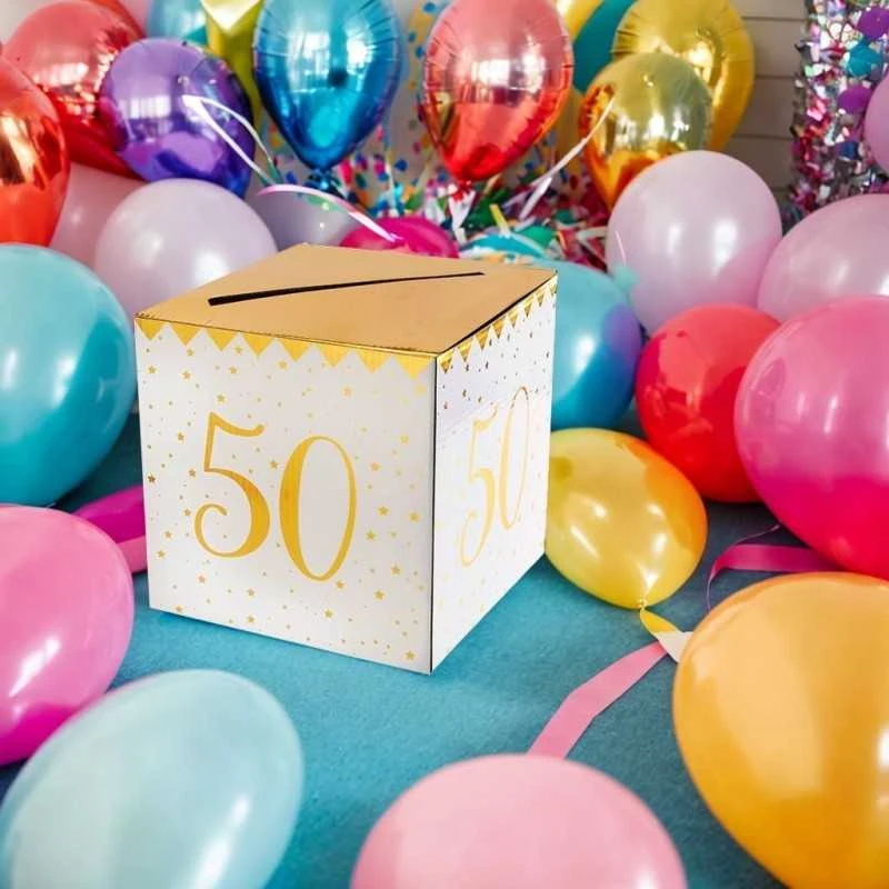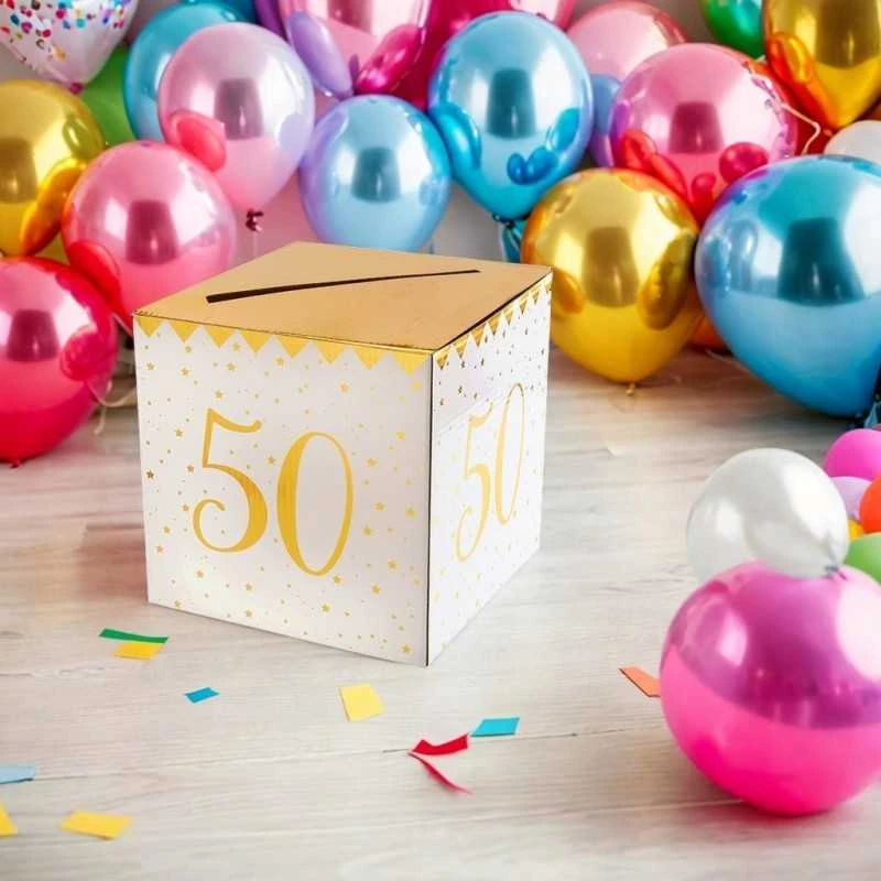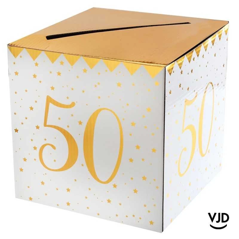 - Lors d’une cinquantaine joyeuse cette tirelire blanc et or métallisée 50 ans risque vraiment d’attirer tous les regards de vos invités lors de l’anniversaire ou la fête que vous organiserez !